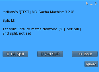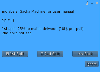 - Split L$: this feature allows the owner to split the earnings from the gacha machine with up to two different avatars. Clicking the Split L$ button will prompt a dedicated sub-menu, where the owner will have to select which split to setup among first and second; after this first choice, the owner will be asked to type the name or UUID (avatar key) of the avatar whom is going to split the profit with, and pick a split percentage between 0% and 100%. If both steps are done correctly, each time a user pays the gacha machine to start a game, the profit is splitted with the avatar declared and the L$ immediately payed out. When this option is active a “check” sign will appear in the corresponding button of the menu and details will be listed in the menu’s header; hitting another time the ‘Split L$’ button will disable the feature for the chosen splitter.