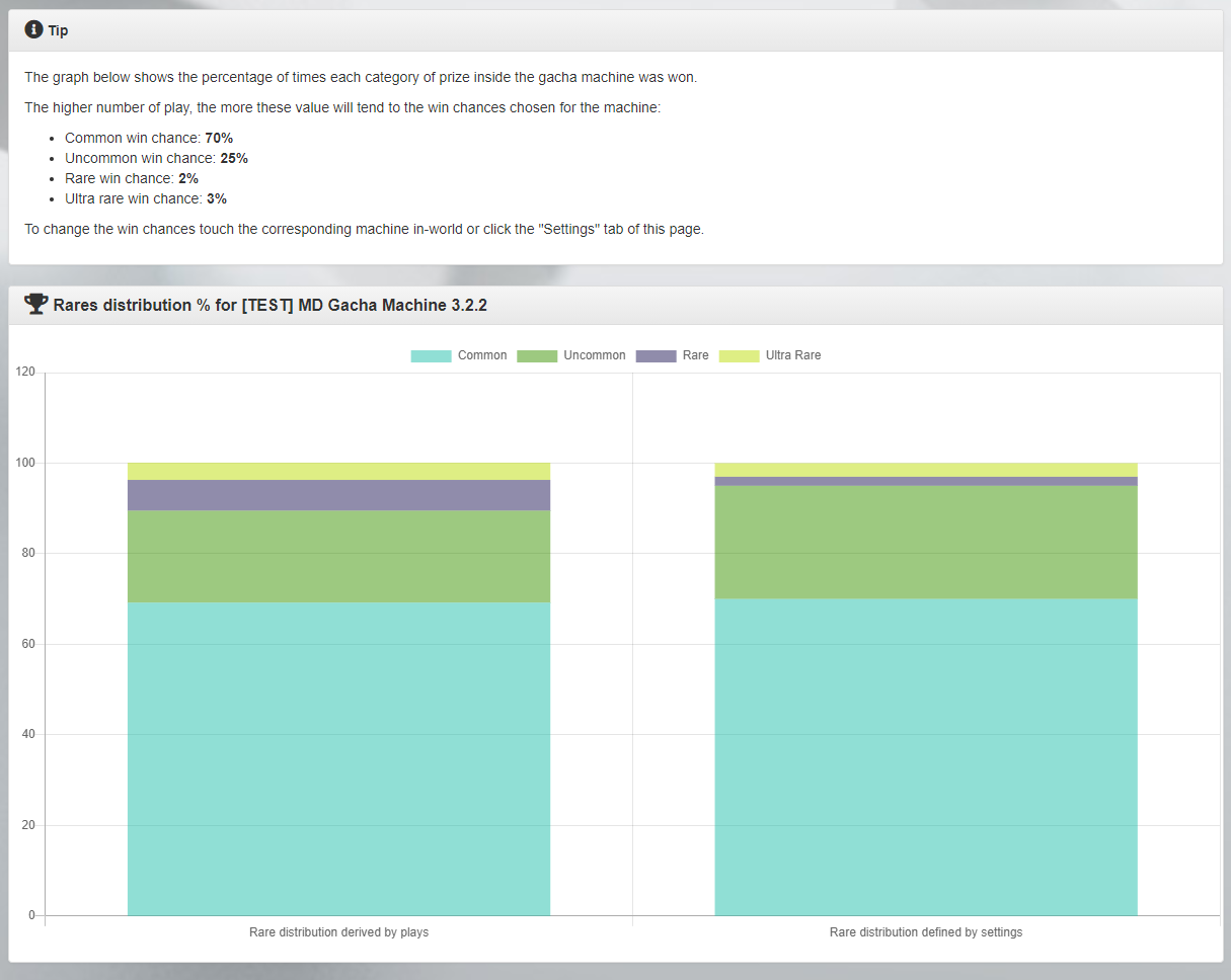 - If a win chance for a category is set – i.e. 10% for rare items – but no items of the specific category are inside the machine, then the win chance for the category is automatically set to 0.