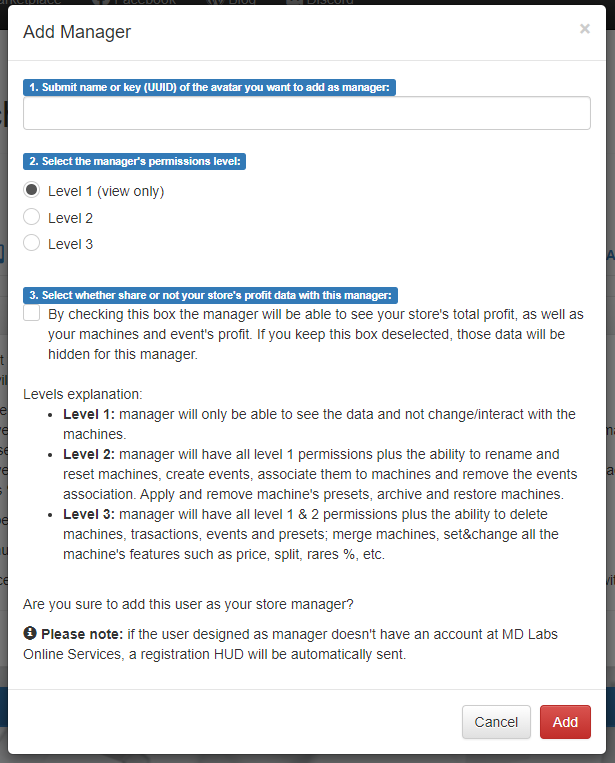 The first thing is provide the manager’s name or key (UUID); then select a permission level and whether share or not the store’s profit data. Once these info are provided, clicking on the ‘Add’ button will add the selected user as store’s manager. The manager will be immediately listed in the ‘Managers ‘ panel which can be found into the ‘Managers’ tab; from here it will be possible to change the manager’s level, toggle the share store’s profit and also remove the manager.