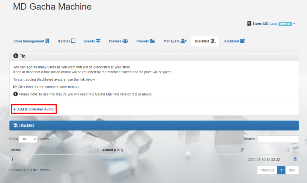 The ‘Blacklist‘ tab allows the owner to block one or more users, preventing them to interact with the store’s machines; this feature is designed to help store owners against impolite or rude users having an unfair attitude, like copybotters or cheaters.